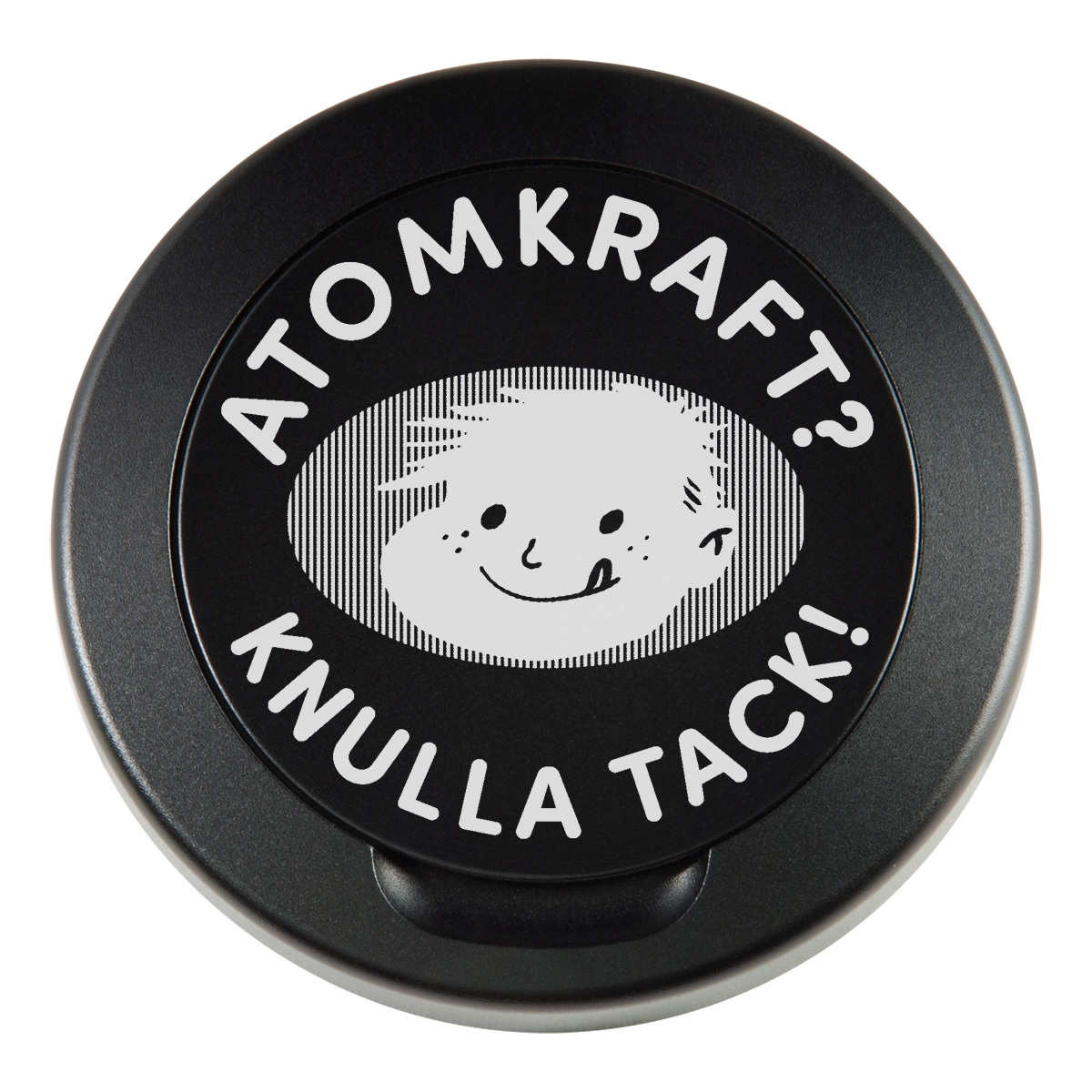 En svart metalldosa med provokativ retroestetik och klassisk Ponyhans-twist. På locket möts du av en leende figur och texten ”Atomkraft? Knulla tack!” – en oblyg parafras på gamla kampanjslogans, nu omstöpt till fickformat-statement.