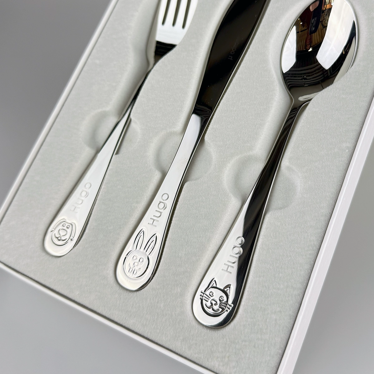 För en ännu mer personlig touch erbjuder vi precisiongravyr med diamantspets, som skapar en klar och distinkt gravyr på besticken. Gravyren placeras omsorgsfullt på skaftets ovansida, precis ovanför den charmigt förtryckta djurdekoren. Du kan välja mellan rak eller kursiv (skrivstil) för att matcha din personliga stil.
