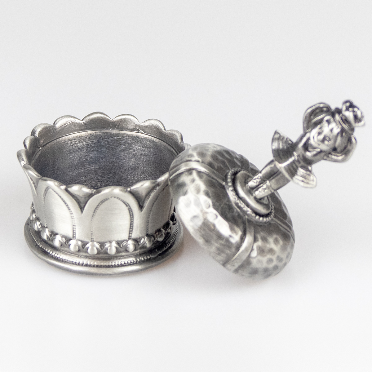Elegant smyckesdosa i metall med tennliknande finish En charmig och dekorativ dosa med en söt prinsessa på locket – perfekt för smyckesförvaring eller som en fin present.