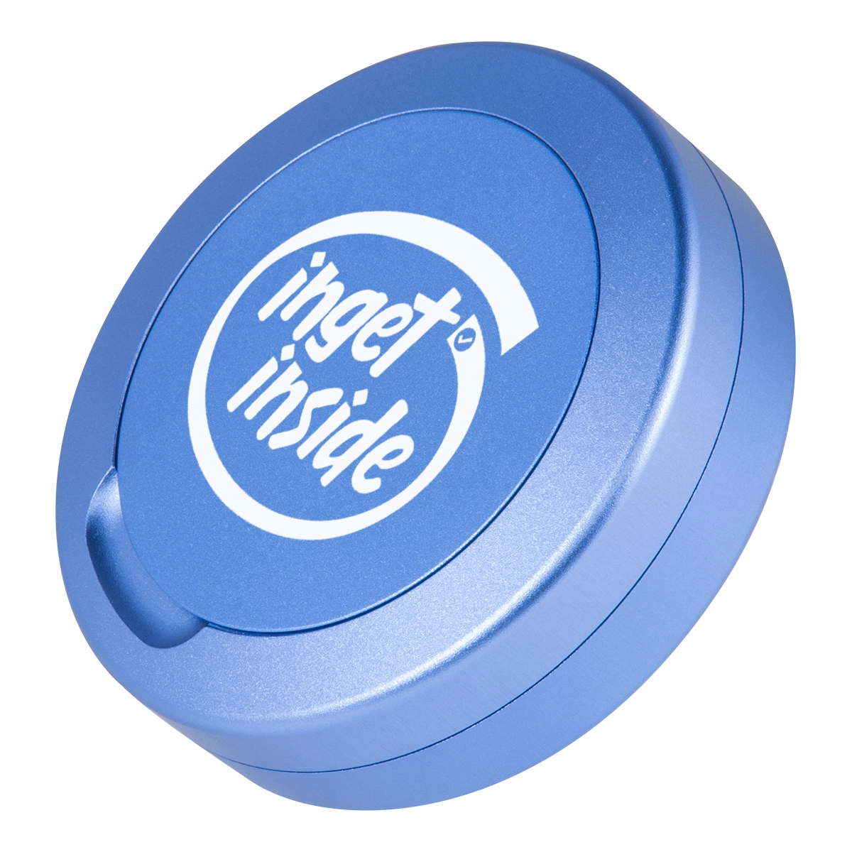 En blå metalldosa inspirerad av klassiska tech-loggor men med den brutala ärligheten man kan vänta sig av Ponyhans: Inget inside. Perfekt för dig som vill signalera att innehållet må vara snus – men det är tomt på andra plan.