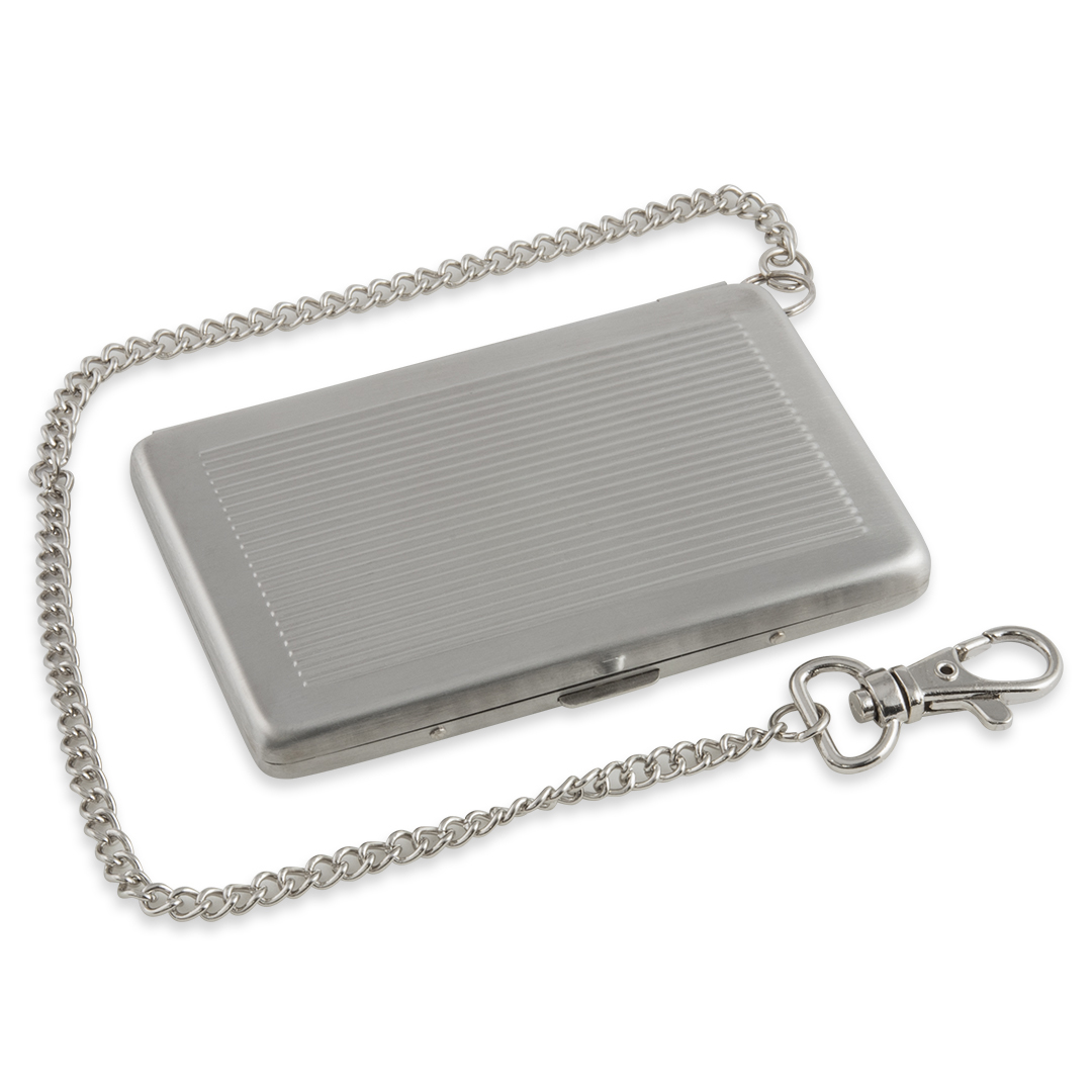 Coolaste plånboken med kedja och karbinhake. Tillverkad i rostfritt stål och med räfflad yta för bra grepp. 6 plastfickor.