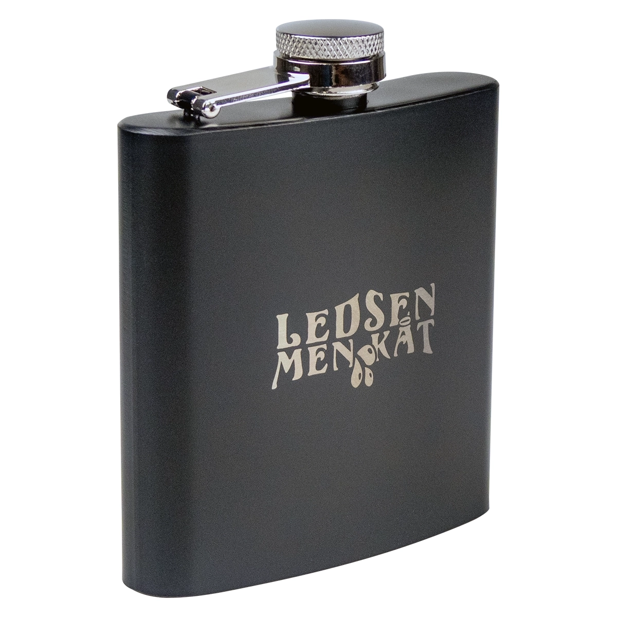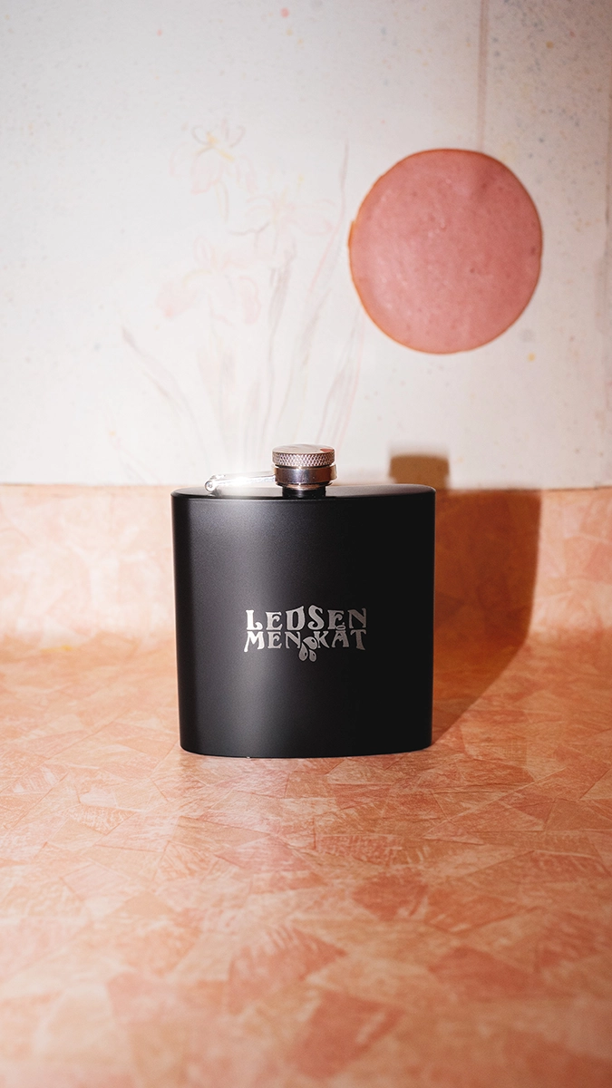 Matt svart metall. Lasergraverad sanning. Texten Ledsen men kåt sitter där den ska och går inte att gnugga bort, till skillnad från ångest, dåliga beslut och vissa relationer.