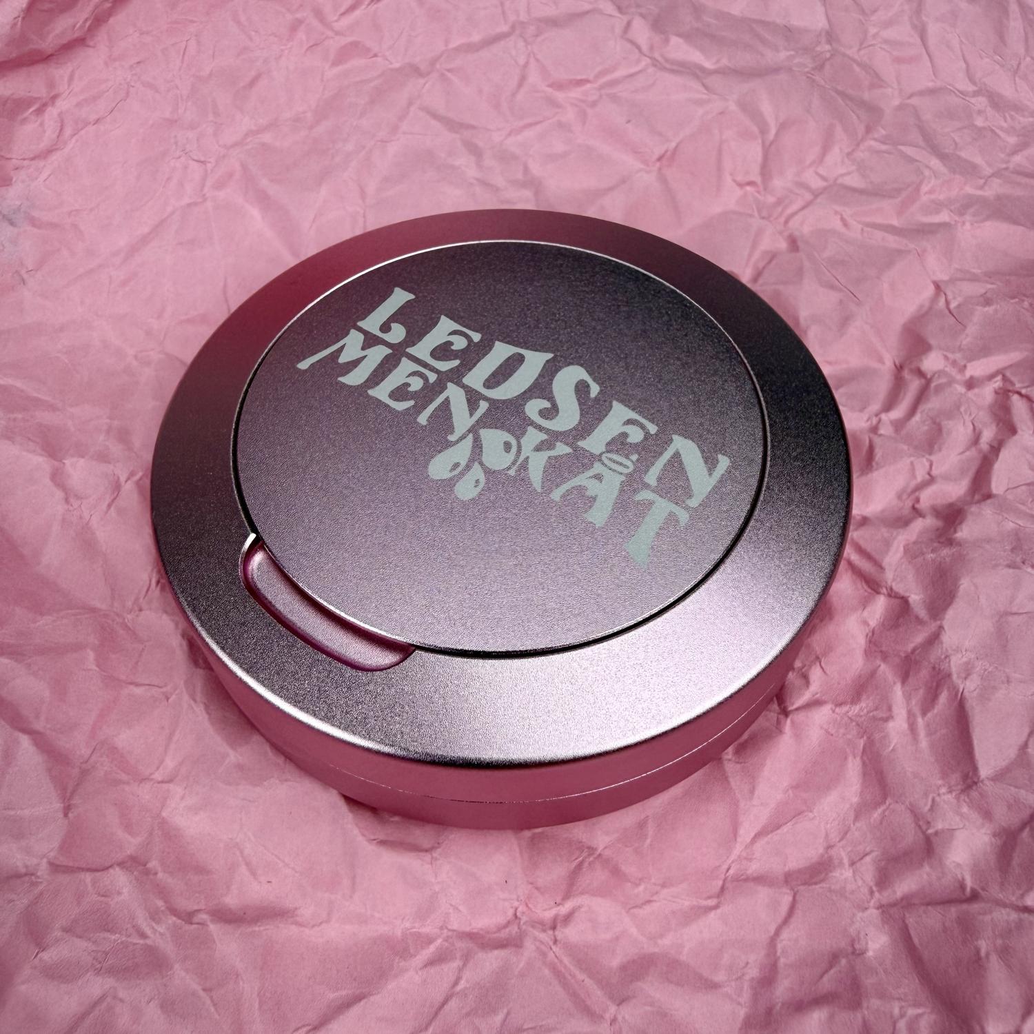 En rosa metallglimmande snusdosa som bär på mer känslor än en hel P3-dokumentär. Texten ”Ledsen men kåt” är Ponyhans poetiska bidrag till samtidens existentiella kaos – inristat på en dosa som rymmer både snus och svårmod.