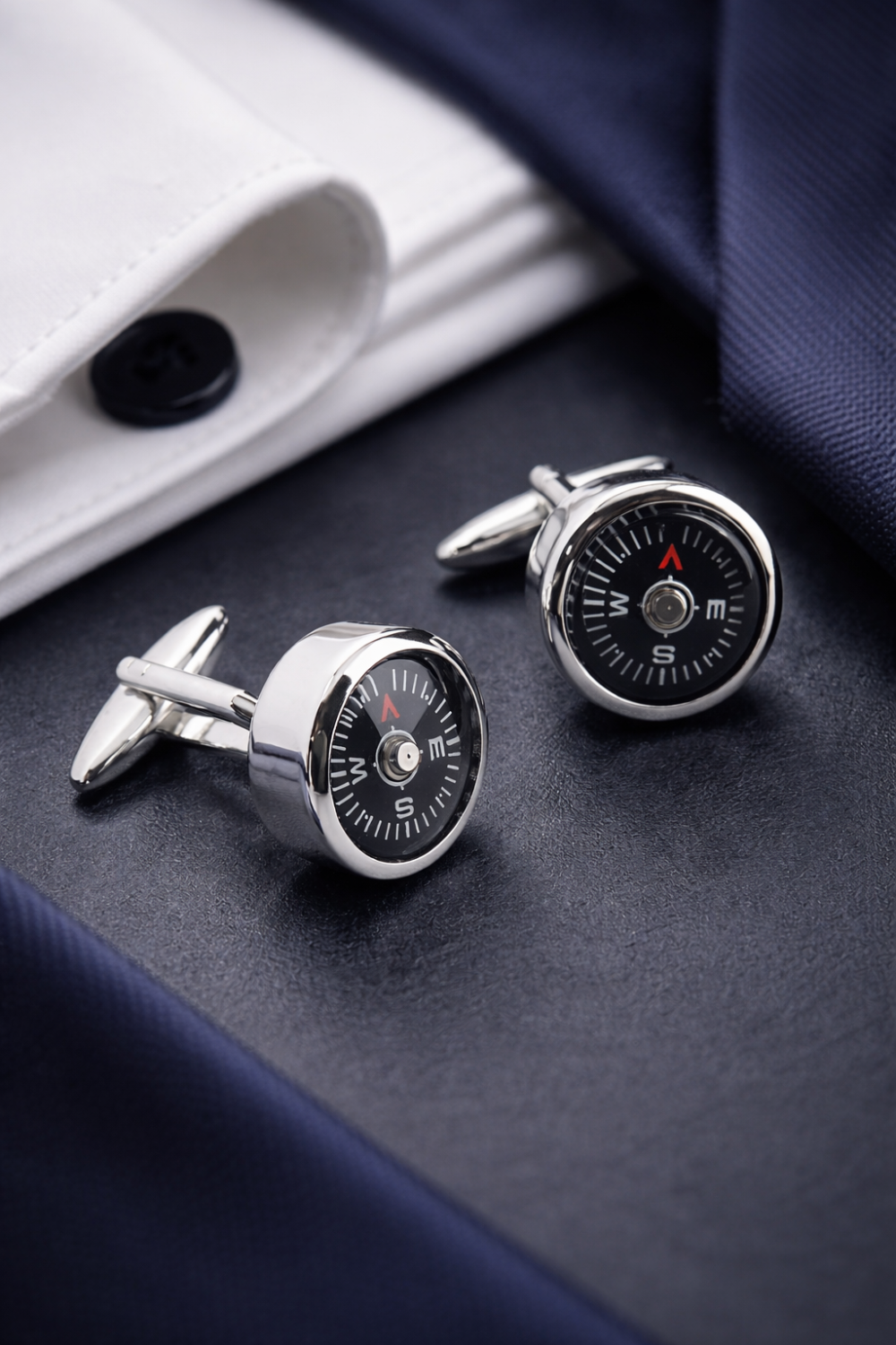 Kompass i manschettformat. Det är idén i sin renaste form: ett diskret par som pekar rätt även när dagen drar åt fel håll. Pilarna på urtavlan markerar väderstrecken, men signalen är tydligast i mötesrummet: du vet vart du ska.