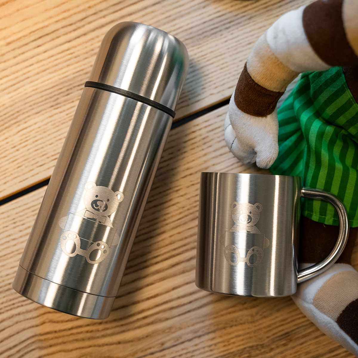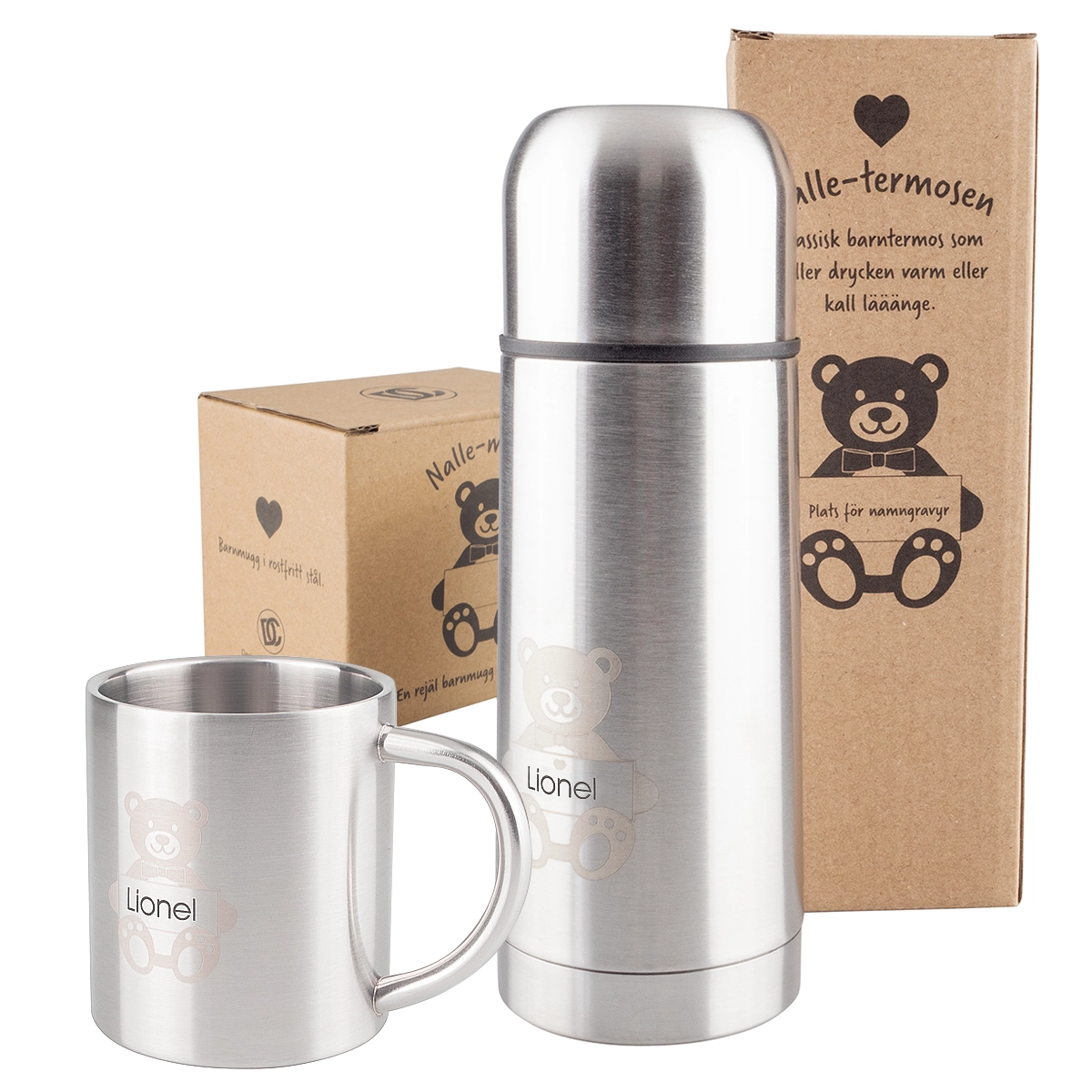 Både termosen och muggen kan graveras med barnets namn – utan extra kostnad. Gravyren placeras vackert på nallens mage och gör varje set helt unikt.