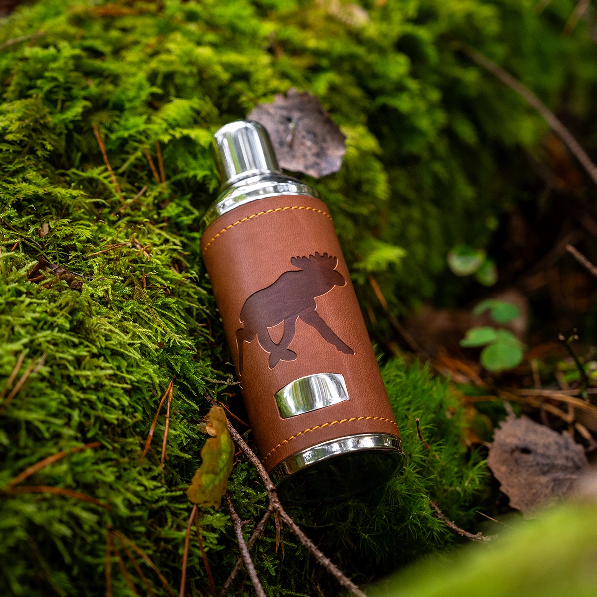 Jaktplunta. En mycket fin rund plunta med konstskinnsöverdrag och älgdekor. På pluntan sitter en liten gravyrplatta.