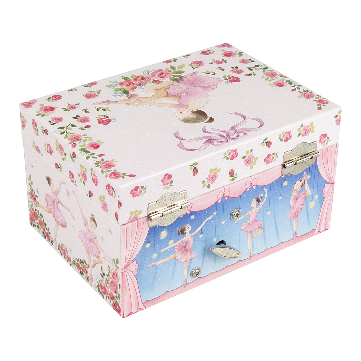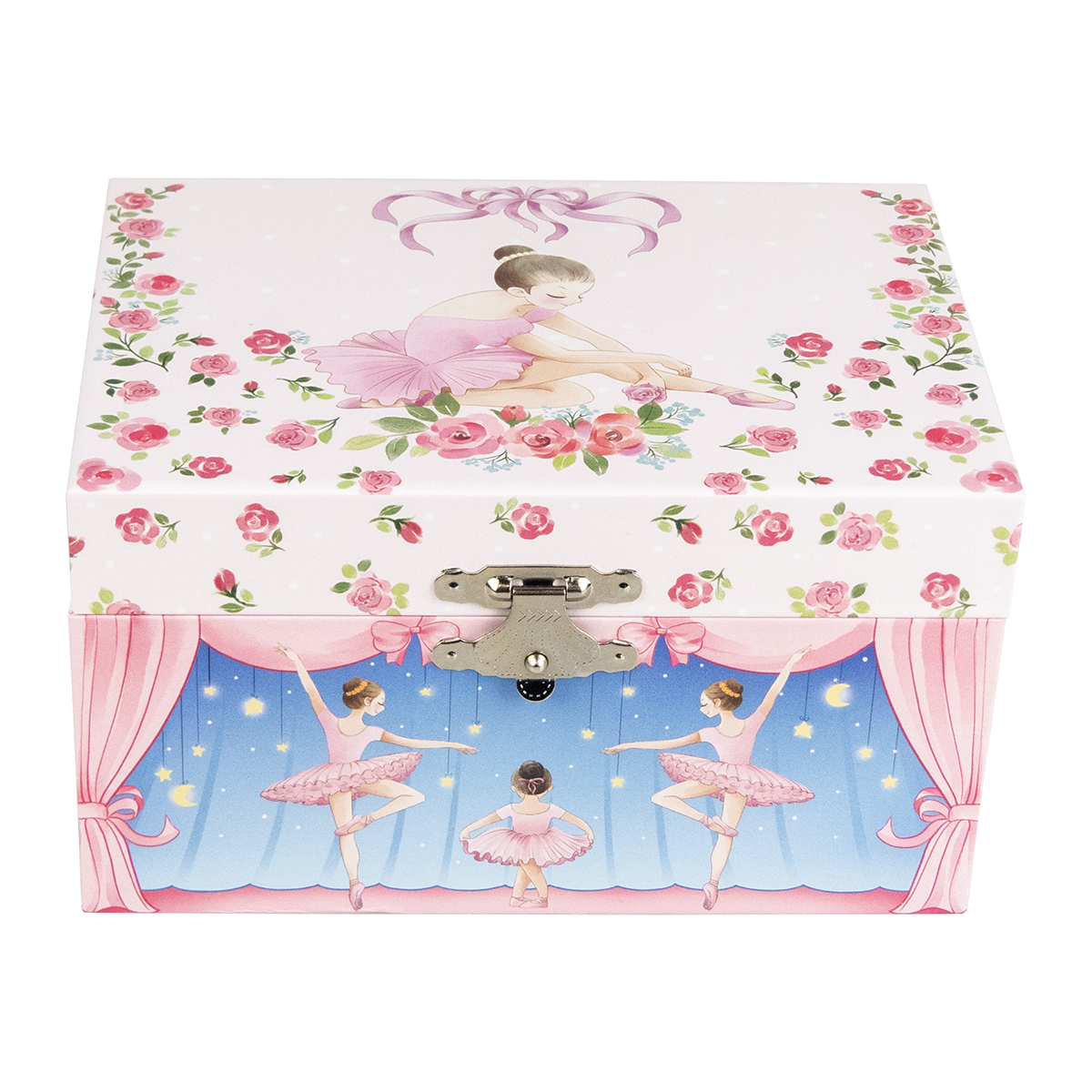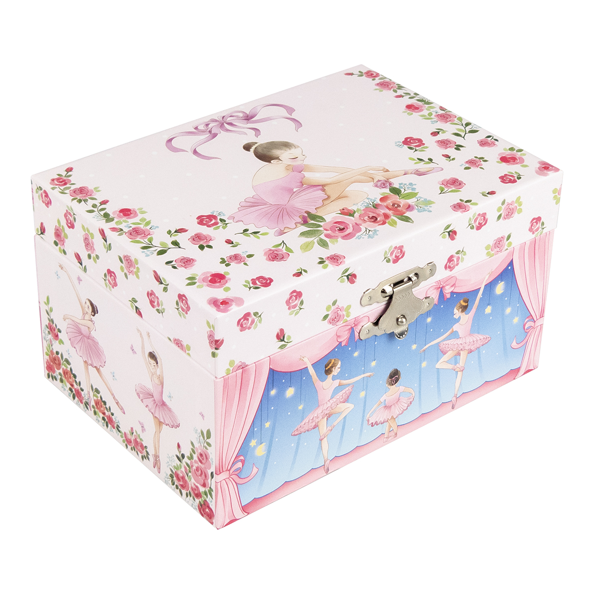 Supersött mattlackerat skrin med vacker ballerina/ballerina-kaniner-dekor. Tillverkad i pressad papp/kartong. Ett stidigt skrin med gångjärn och lås i metall. Smyckeskrinet har uppdragbar speldosa som spelar Svansjön. När locket öppnas spelar skrinet och en ballerina snurrar runt i en piruett. Ett klassiskt ballerinaskrin som länge varit en omtyckt present till barn.