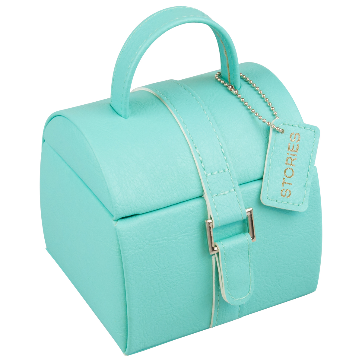 Smyckeskrin turkos tillverkad i PU (konstläder). Med förvaring i två våningar. Storlek 10,5x11x14cm.