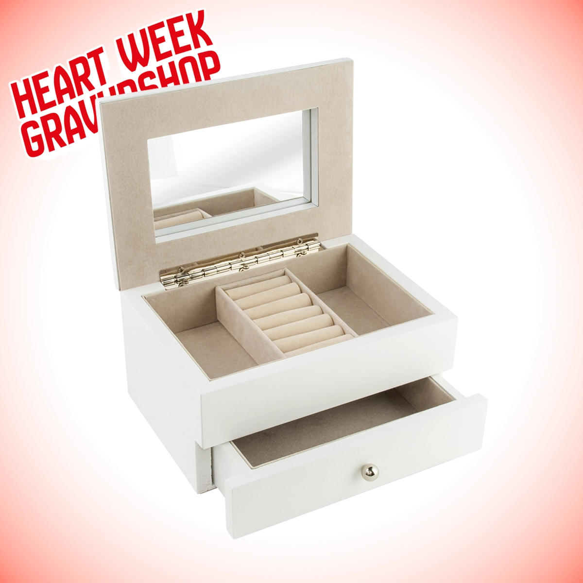 Ett underbart smyckeskrin med utdragbar låda – elegant, praktiskt och perfekt som personlig gåva. På locket sitter ett vackert dekorerat metallinlägg som kan graveras med namn, datum, hälsning eller motiv för att göra skrinet unikt.