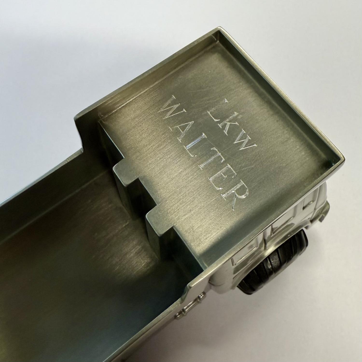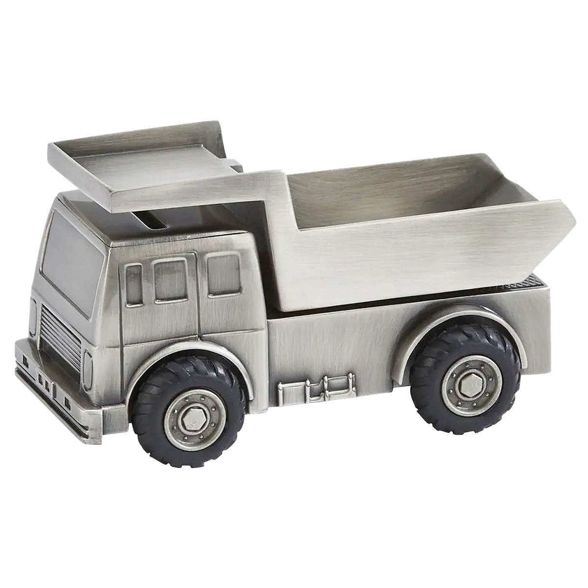 Rolig lastbil med gummihjul och tippbart flak. Tillverkad i metall med tennliknande borstad yta.