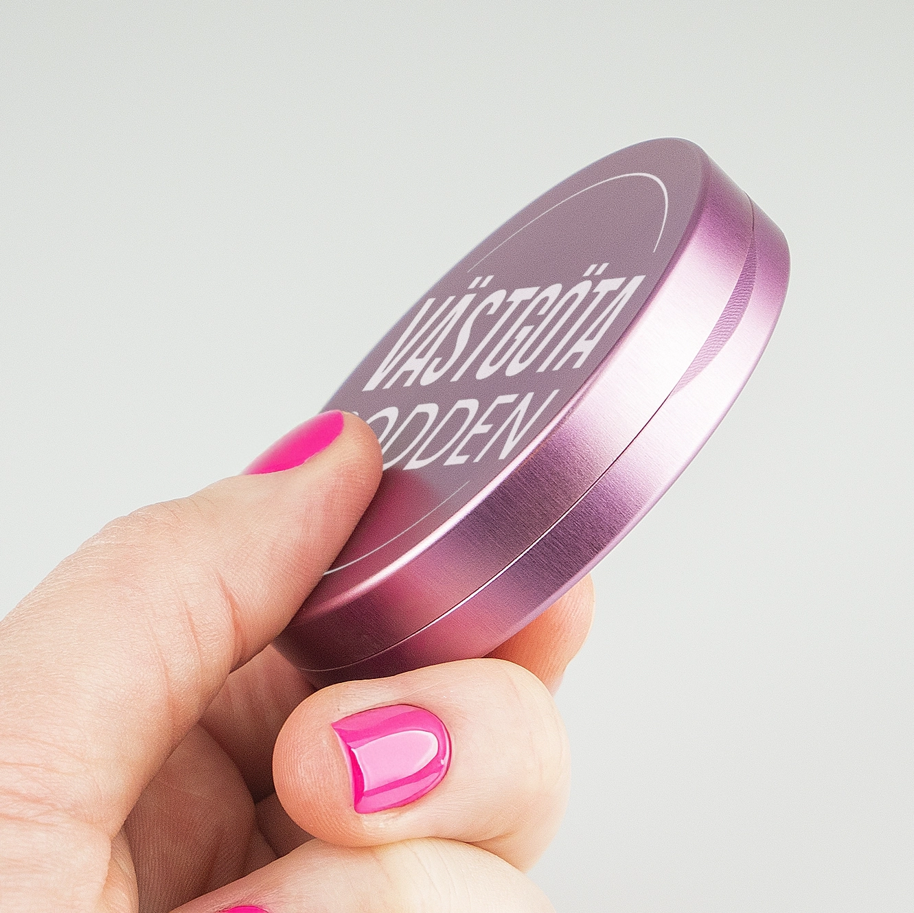Händig å slimmad i ficka! En rejäl snusdosa i aluminium me’ grymt snygg Västgötapodden-dekor å QR-kod som tar dig raka vägen te grabbarnas podd på Spotify. Svart eller rosa-eloxerad yta som e’ både tålig å stilig, å locket har gummipackning så snuset håller sig färskt längre. Slimmad modell som glider ner i fickan som en smäck!